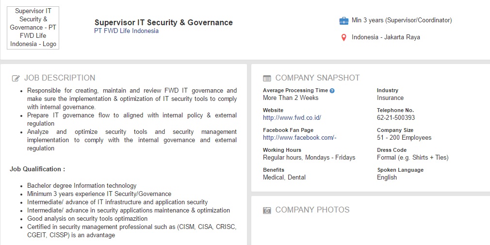 Informasi selangkapnya terkait pendaftaran online dan detailnya dapat diakses di http://www.jobstreet.co.id/en/job/supervisor-it-security-governance-1883587?fr=21