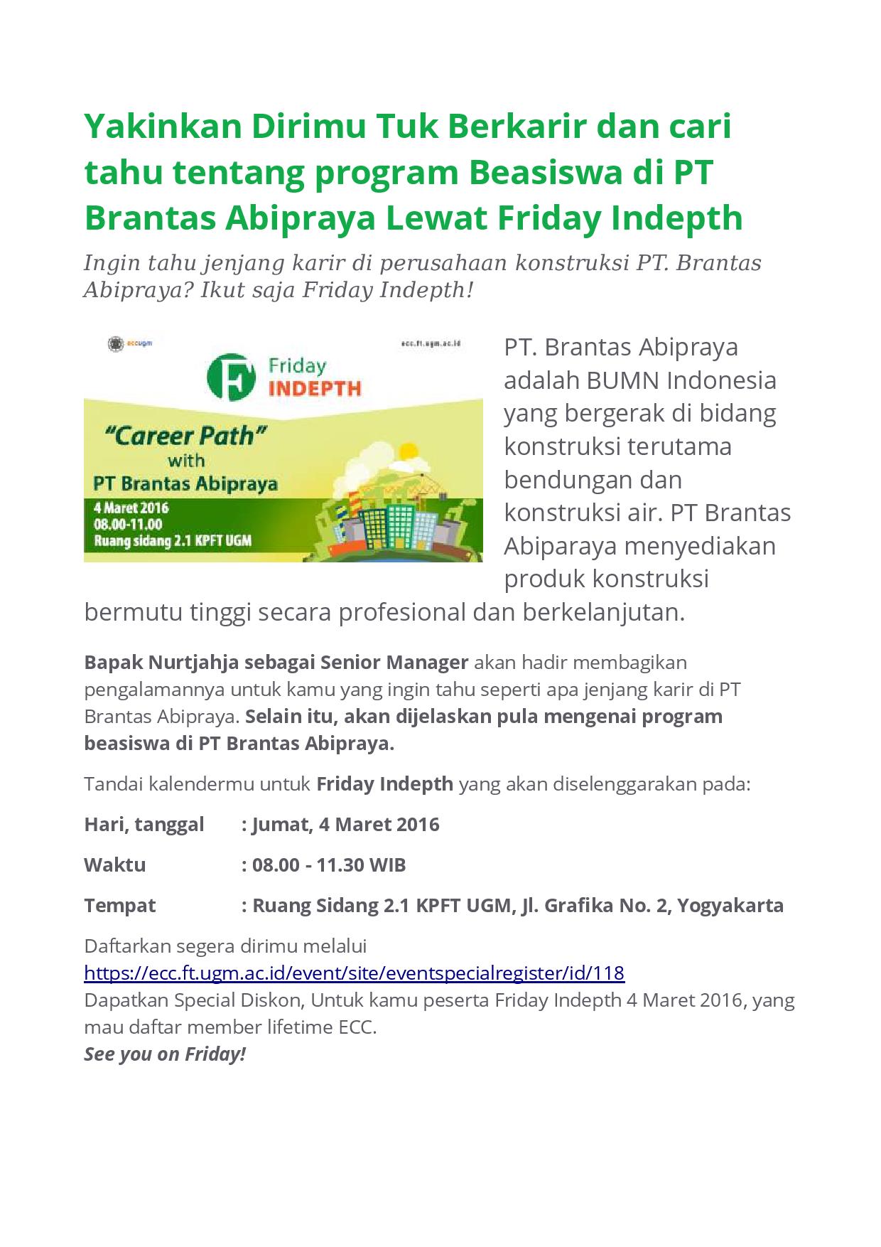 Dalam rangka mendukung sasaran pertumbuhan Perusahaan sesuai Rencana Kerja & Anggaran Perusahaan (RKAP) tahunan dan Rencana Jangka Panjang Perusahaan (RJPP), kami membutuhkan talenta-talenta muda yang handal, professional dan memiliki hasrat kuat untuk maju. Untuk itu kami bermaksud mengajukan kerjasama dalam pemberian Beasiswa untuk Mahasiswa Program S1 Jurusan Teknik Sipil, Teknik Elektro, Teknik Mesin, Teknik Arsitektur, Teknik Industri dan Program S1 Jurusan Akuntansi dengan jaminan bekerja di PT Brantas Abipraya (Persero) dengan ketentuan dan syarat yang berlaku.