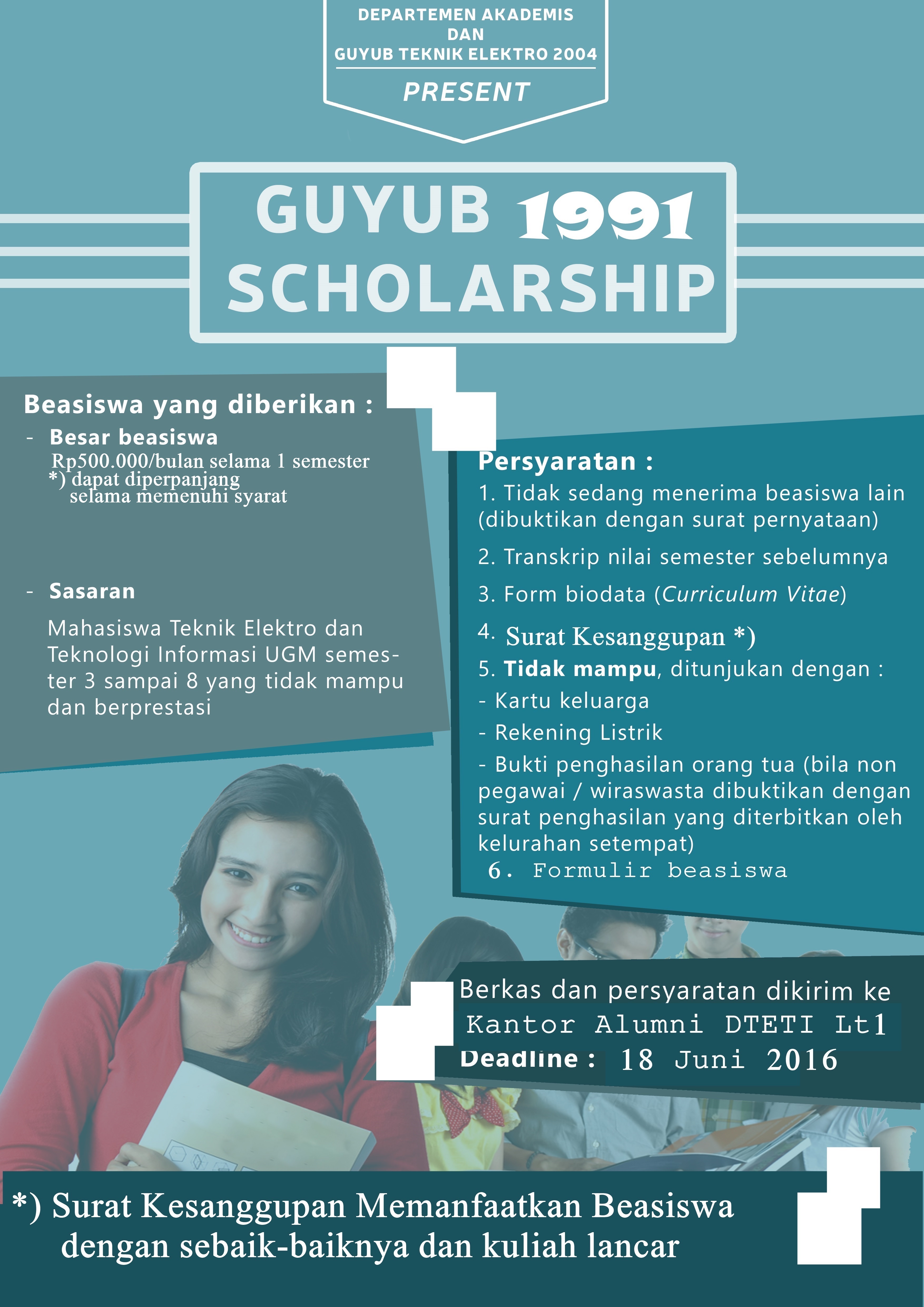 Departemen Teknik Elektro dan Teknologi Informasi Fakultas Teknik Universitas Gadjah Mada (DTETI FT UGM) kembali berbangga dan mengapresiasi para alumni yang telah memberikan sumbangsih beasiswa pendidikan untuk adik-adik angkatannya. Dalam kesempatan ini, Guyub Alumni Angkatan 1991 ikut berpartisipasi dengan memberikan beasiswa pendidikan guyub 91. Bagi mahasiswa yang memenuhi kriteria di bawah ini, silakan mendaftarkan diri.