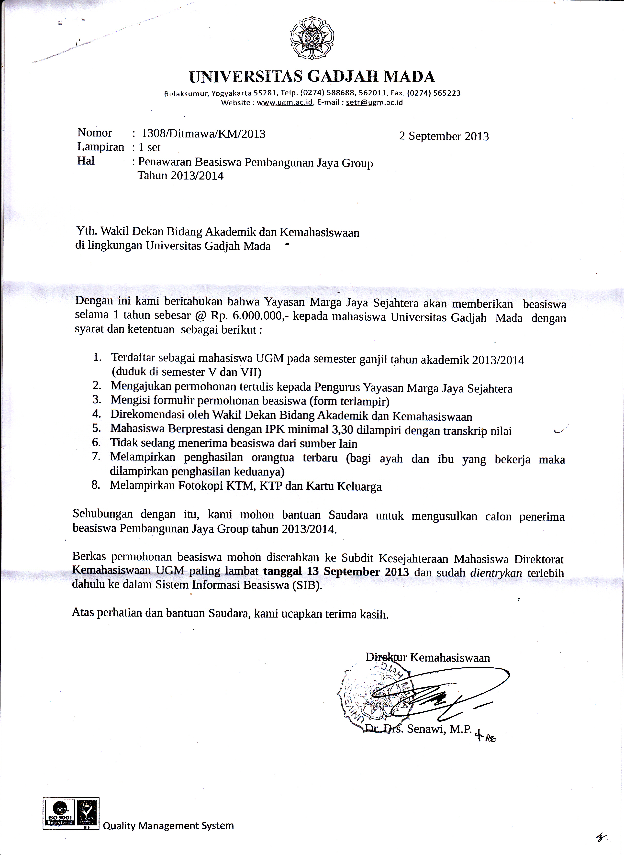 Yayasan Marga Jaya Sejahtera akan memberikan beasiswa selama 1 tahun sebesar Rp 6.000.000,- kepada mahasiswa Univeristas Gadjah Mada. Berkas Persyaratan diserahkan ke Kemahasiswaan Fakultas Teknik UGM paling lambat 13 September 2013.