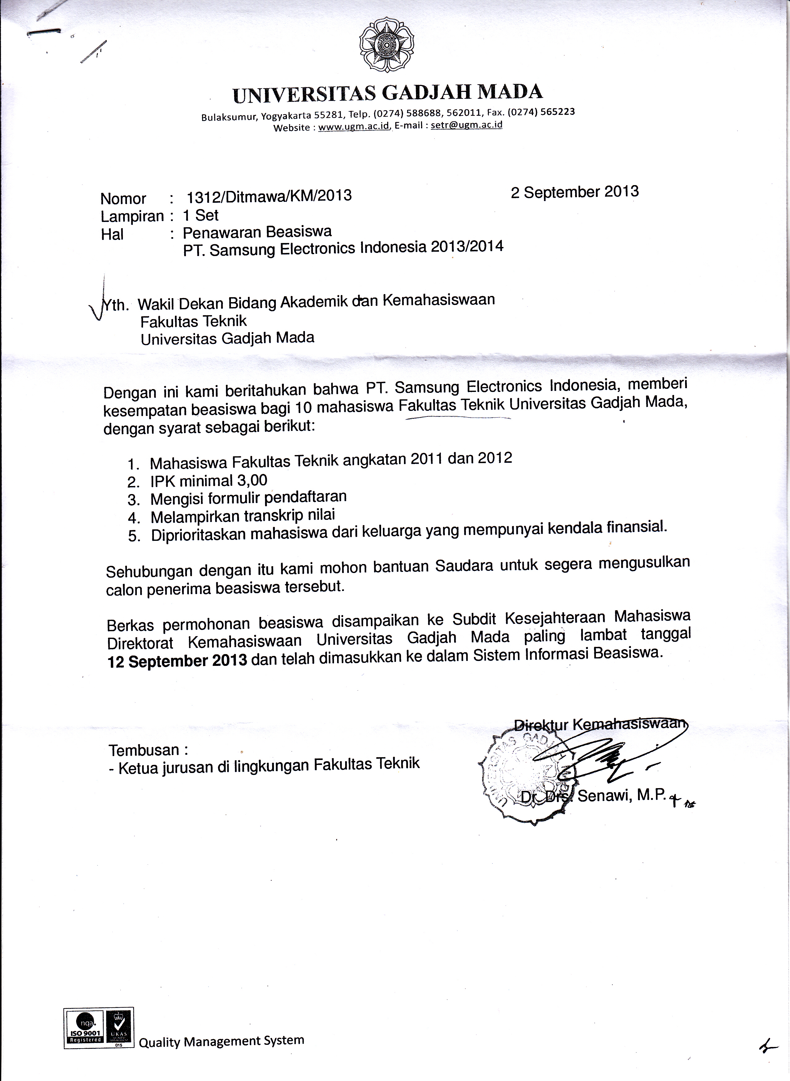 PT Samsung Electrics Indonesia memberi kesempatan beasiswa bagi 10 mahasiswa Fakultas Teknik Universitas Gadjah Mada dengan syarat sebagai berikut :
